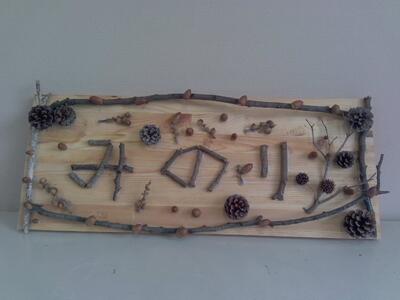 児童が秋の実り、どんぐり・まつぼっくり他で作成しています。